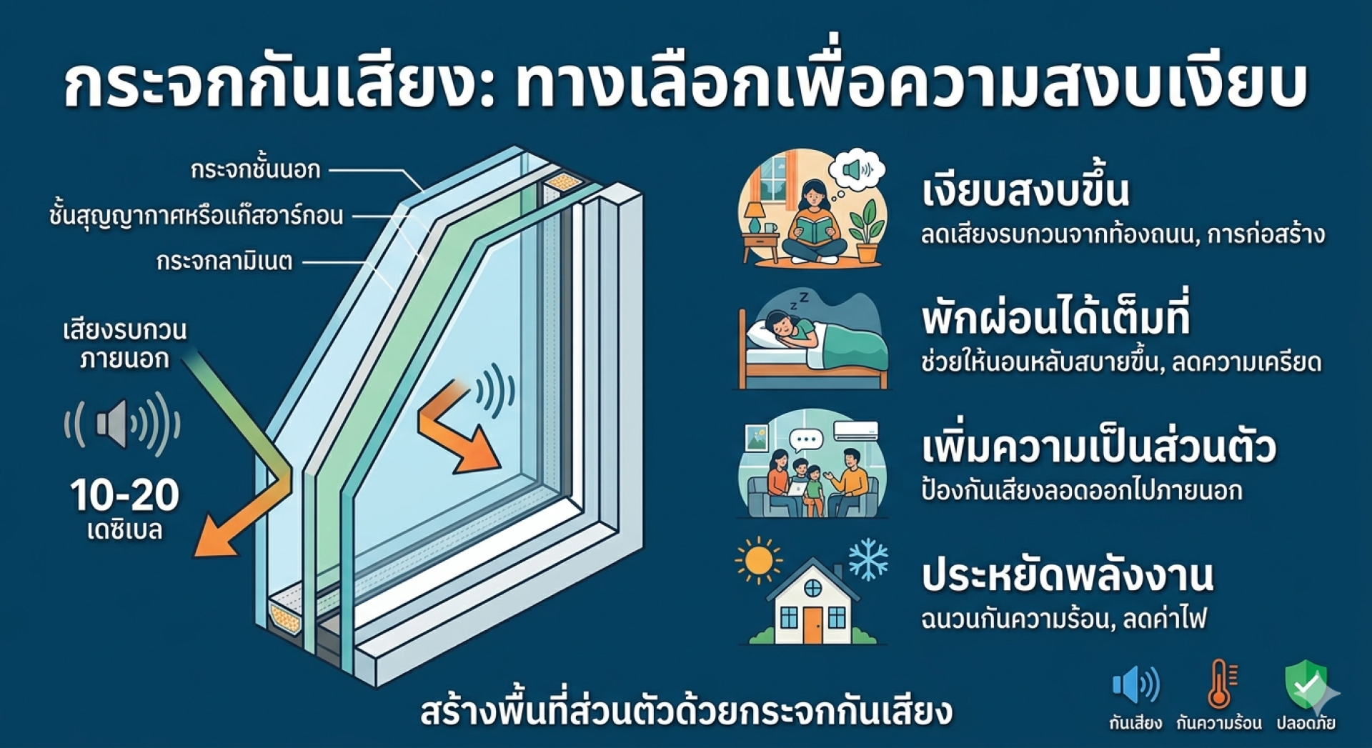- ติดตั้งอย่างถูกวิธีและแน่นหนา เพื่อป้องกันเสียงรั่วไหลผ่านช่องว่างหรือรอยต่อของกระจก