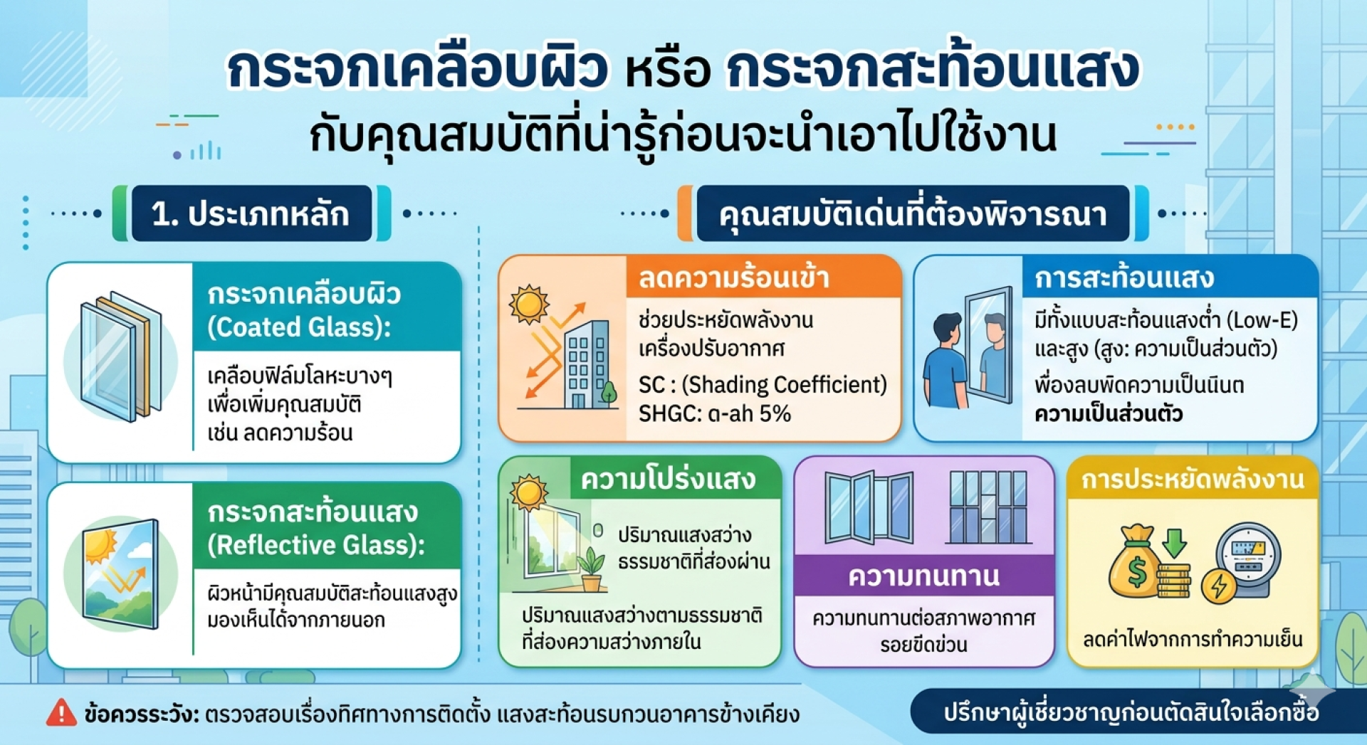 เพื่อให้การใช้งานกระจกเคลือบผิวได้ผลลัพธ์ที่ดีที่สุดและคุ้มค่ากับการลงทุน มีข้อควรระวังและคำแนะนำที่ควรพิจารณาดังนี้